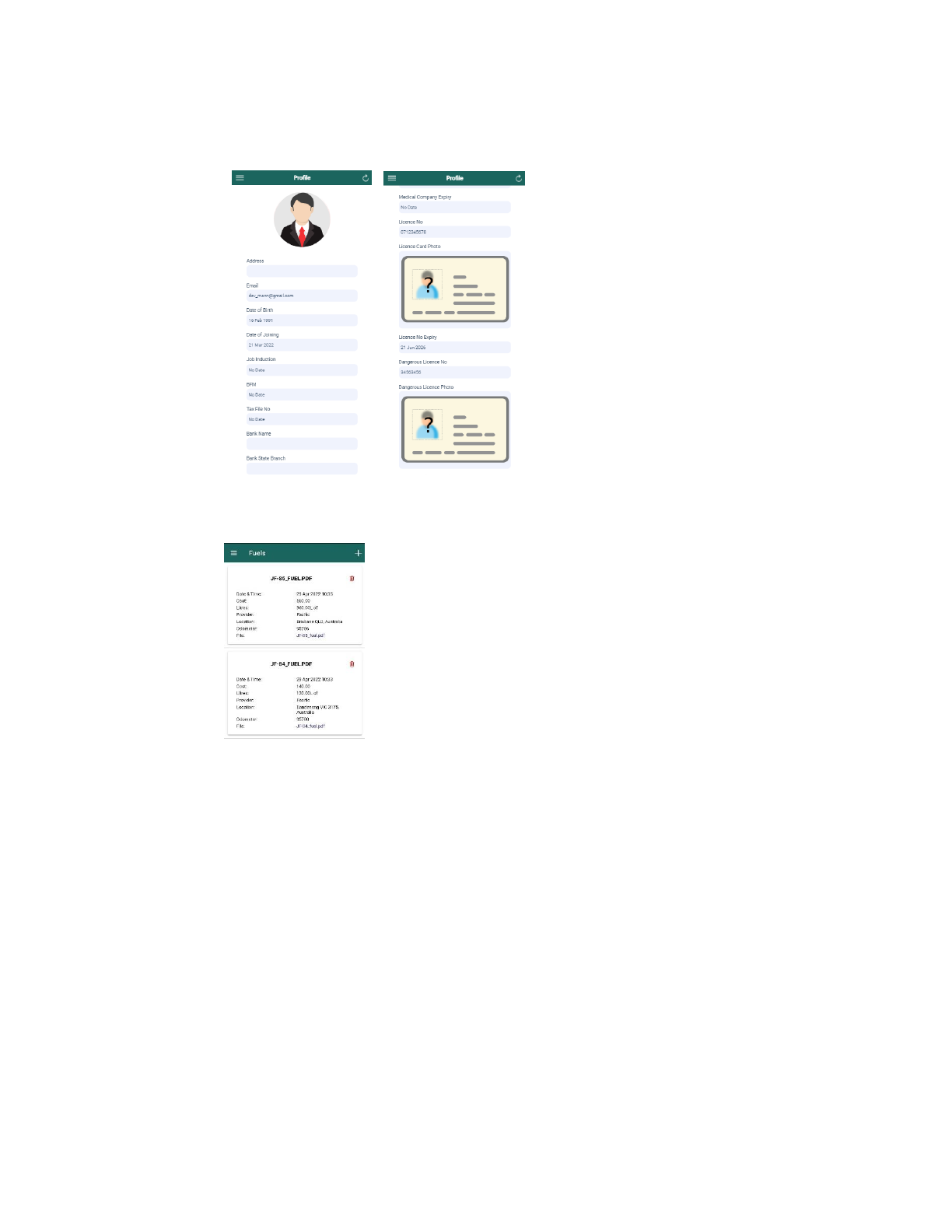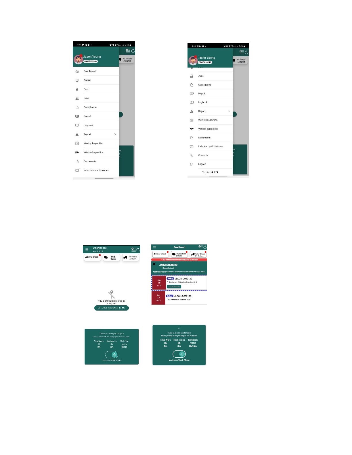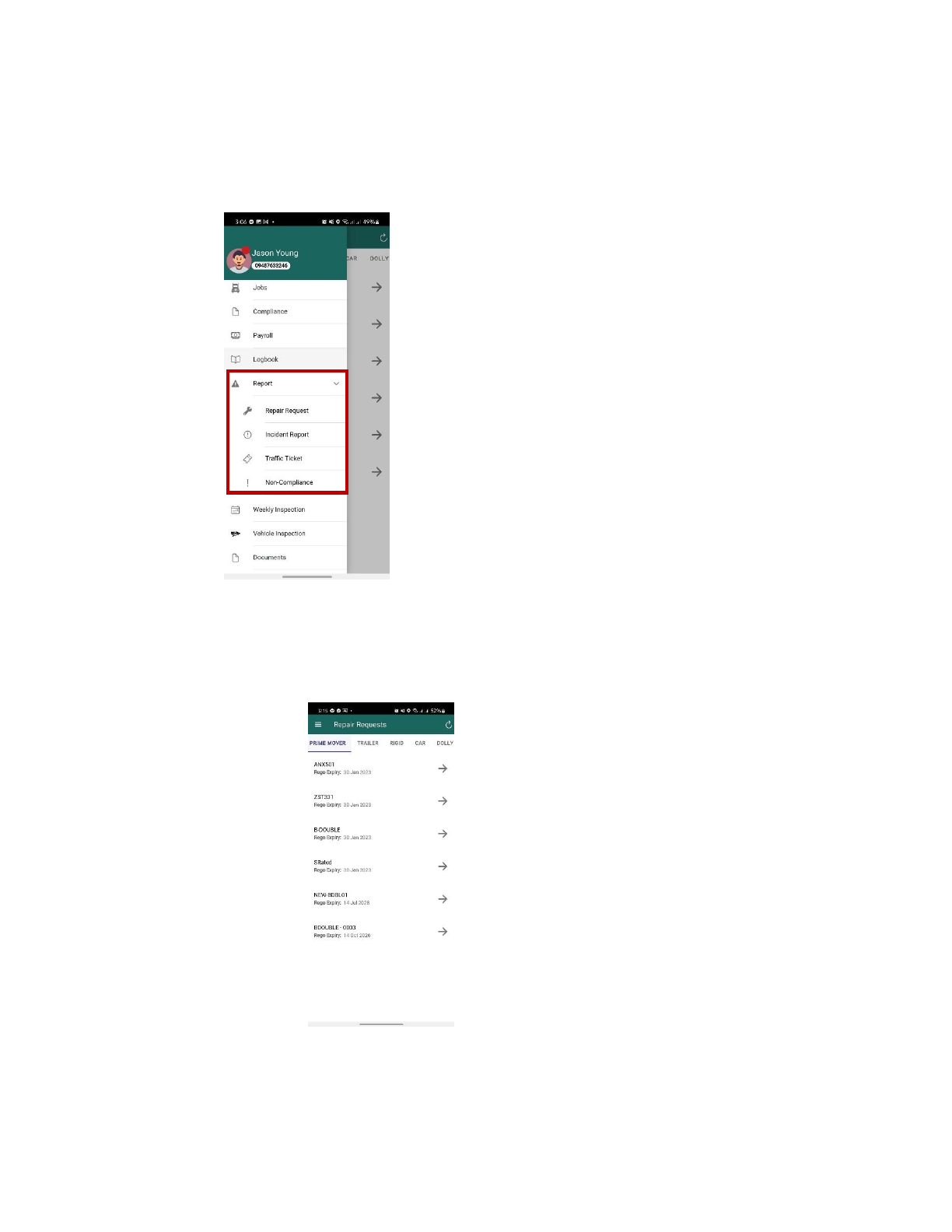 Profile, Fuel, Jobs, Compliance, Payroll, Logbook, Report, Weekly Inspection, Vehicle Inspection, Documents,