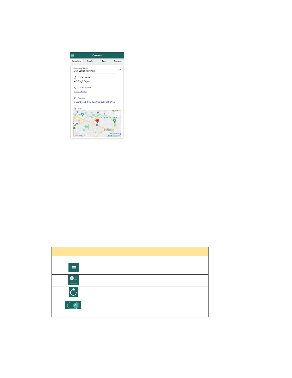 12. Contacts This component displays a list of necessary contacts for operations, repairs, tyres, and